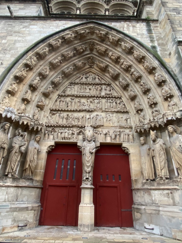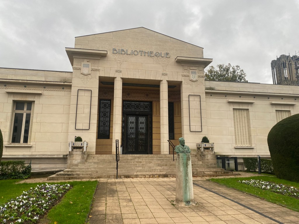 We could not drink all day, so we took a nice rainy stroll around Reims après champagne. The first building of note we passed was the Carnegie Library of Reims. Remember when I mentioned our visit to the American Library in Paris? One of the topics at our Library lecture included the expansion of American-style free lending libraries. Between 1883 and especially after WWI, up until the 1929 Stock Market crash, Andrew Carnegie funded the expansion of libraries worldwide and in the European countries of Belgium, France, Ireland, Netherlands, Serbia and United Kingdom. The Carnegie Bibliothèque of Reims has been open since 1928 and is one of the libraries Carnegie funded after WWI. He helped to restore libraries in cities that suffered tremendous damage during the Great War.