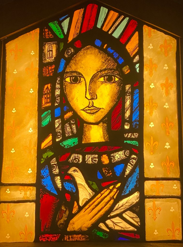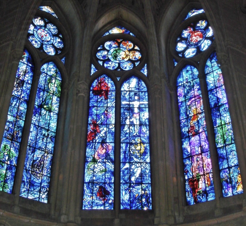Around the corner is the Reims Cathedral and like every Cathedral that I have visited in France, it is aptly named Cathédrale Notre-Dame (complete with flying buttresses). This 800+ year-old medieval cathedral is the Westminster Abbey of France as it has hosted the coronations of 26 French monarchs and is the site of the birth of Christianity in France. John D. Rockefeller was instrumental in financing the repairs needed to this cathedral after WWI. These American industrialists were clearly in competition to get credit for rebuilding war torn Europe post WWI. The cathedral has stained glass depictions of the preparation of champagne as well as those by Marc Chagall, with symbols of the Hebrew and Christian bibles. I also loved the stained glass Joan of Arc, pictured below.
