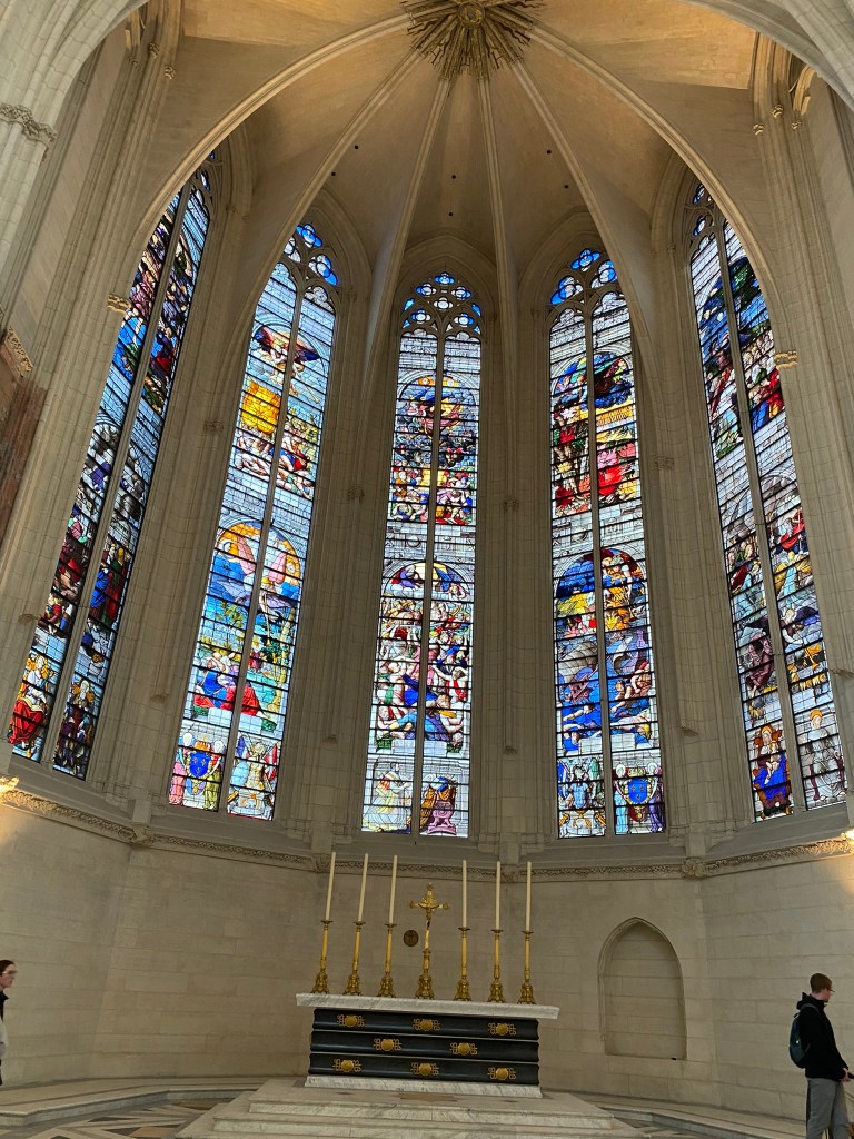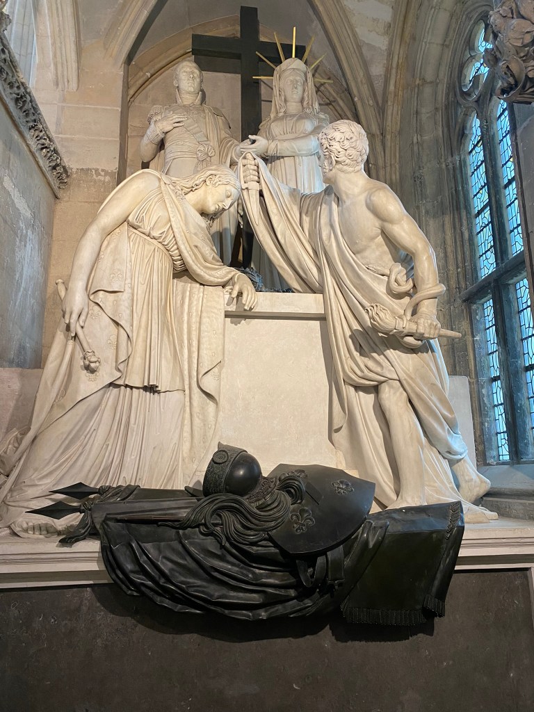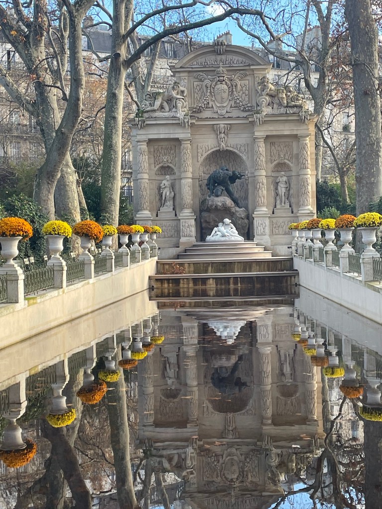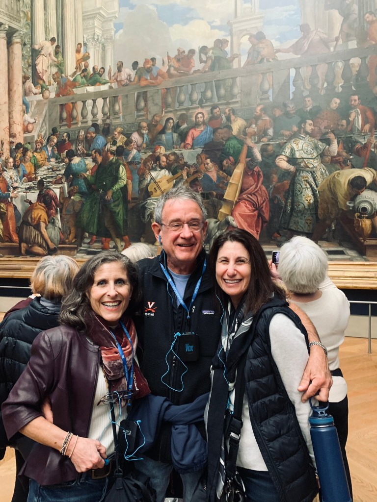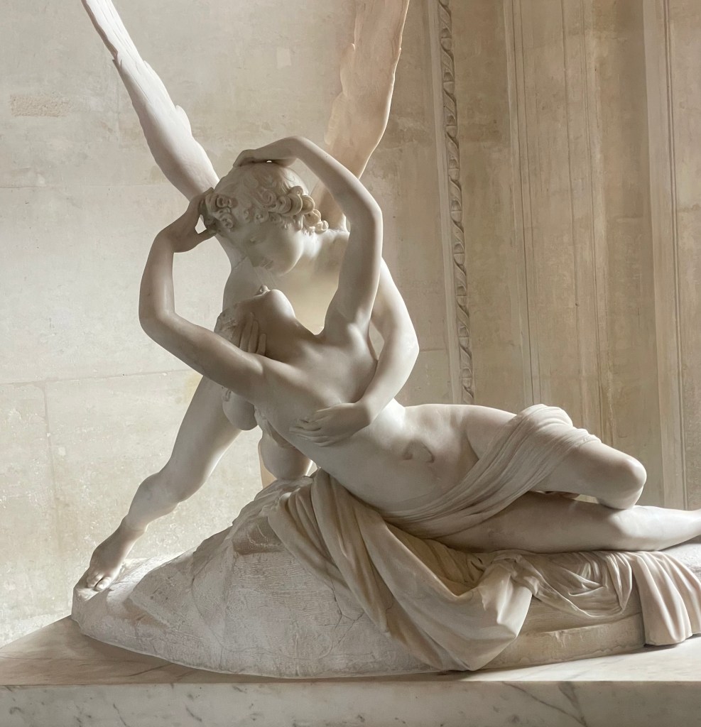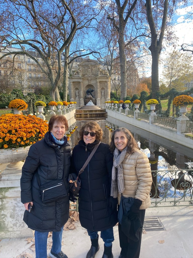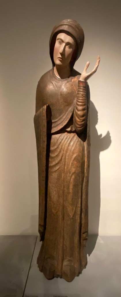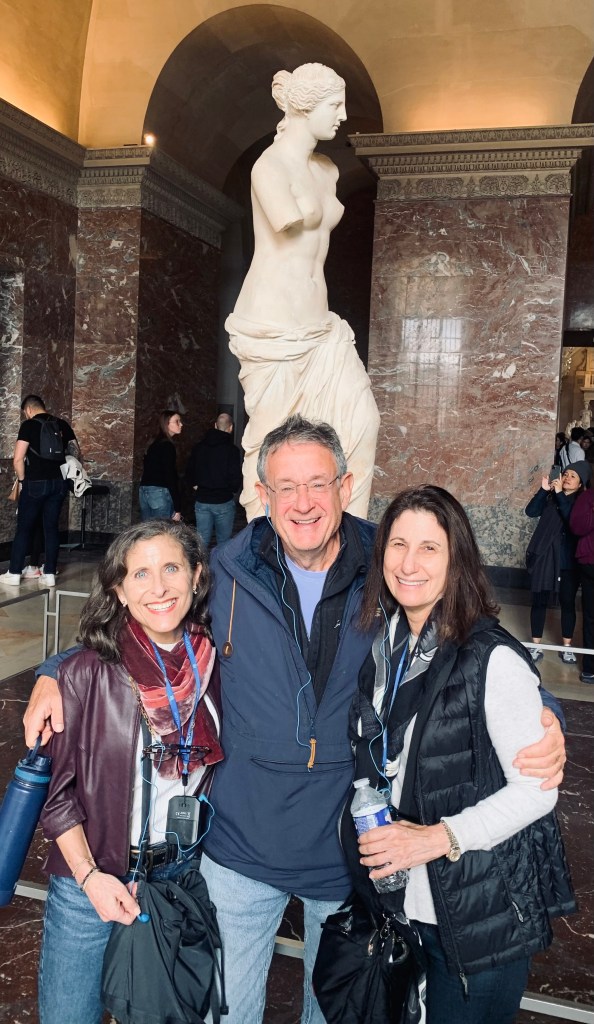 Arlene & David had not been in Paris for many years and enjoyed a few days with us in early November. I tagged along with them on their Louvre tour. I must say, the most visited museum in the world is very special and a must-see and it is much easier to access if one arranges for a guide. We took a small group tour. As expected, the tour included Venus de Milo, Winged Victory, the Crowning of Napolean, the Raft of the Medusa and the Mona Lisa — all spectacular for their beauty and historical significance. That said, Arlene and I availed ourselves of a few calmer galleries which would be my choice going forward, having seen the aforementioned classics at least four times over the years. One gallery of treasures is a temporary exhibit of items saved from the Notre Dame fire of 2019. [And as an aside, we have visited Notre Dame’s exterior multiple time to check on the progress and read about the incredible restoration work, on panels surrounding the scaffolded cathedral. Tourists come to sit in front of Notre Dame on stadium-like seating in front of the cathedral to honor Our Lady at all hours. And as of last week’s visit by French President Macron, Mass can take place in time for the Paris Olympics; however all the work will not be finished. The cost of repair and restoration so far has been about $197 million.]