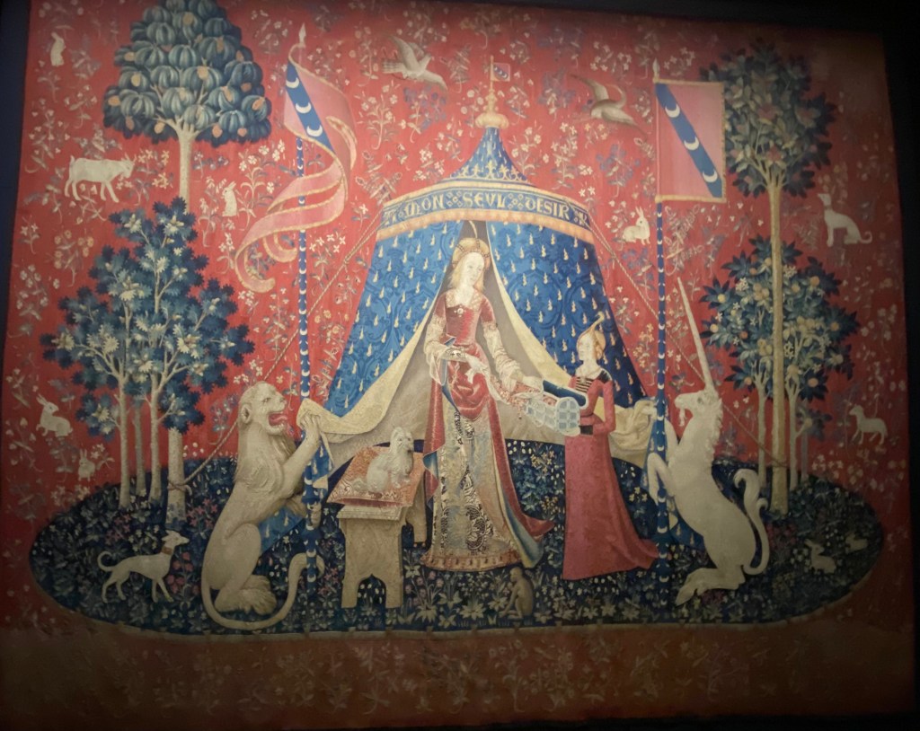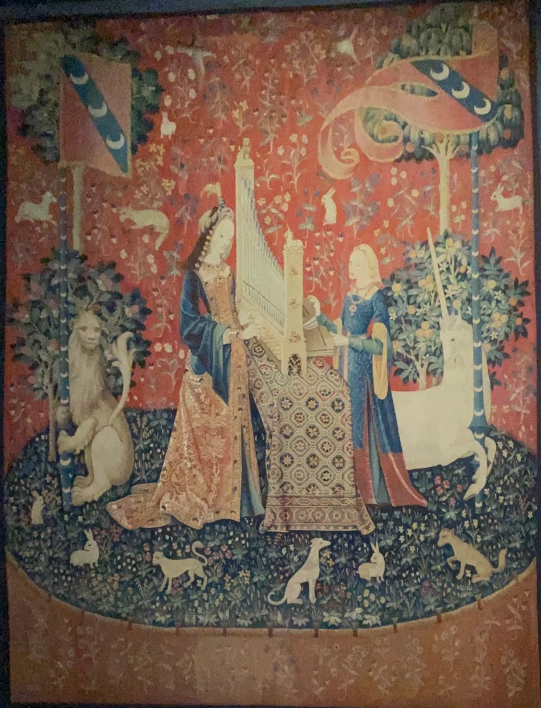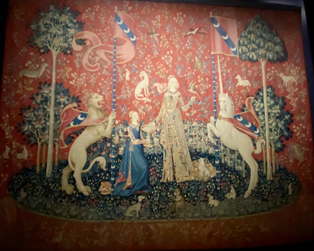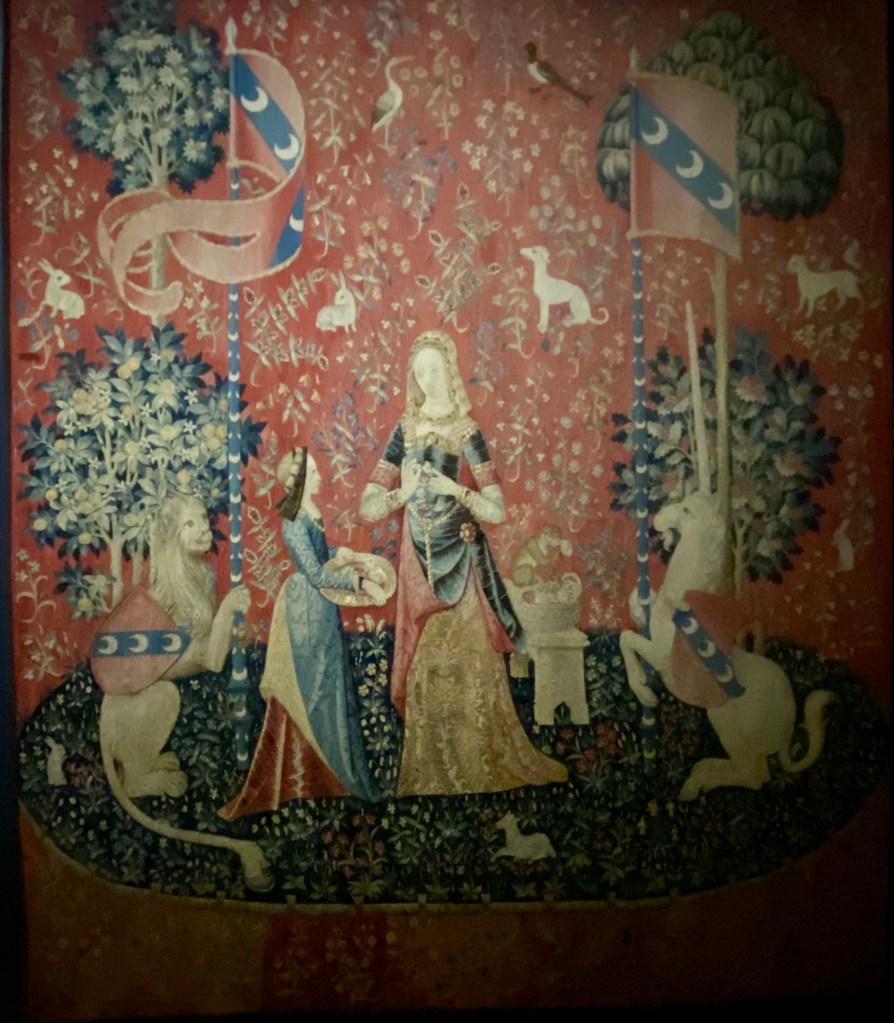 What Cluny is most famous for is tapestries. Here is a series called The Lady and the Unicorn, six tapestries, five of which depict the senses from the late 15th and early 16th centuries. Notice the floral motifs, referred to as the millefleurs style which remind me of William Morris designs.