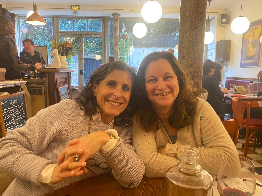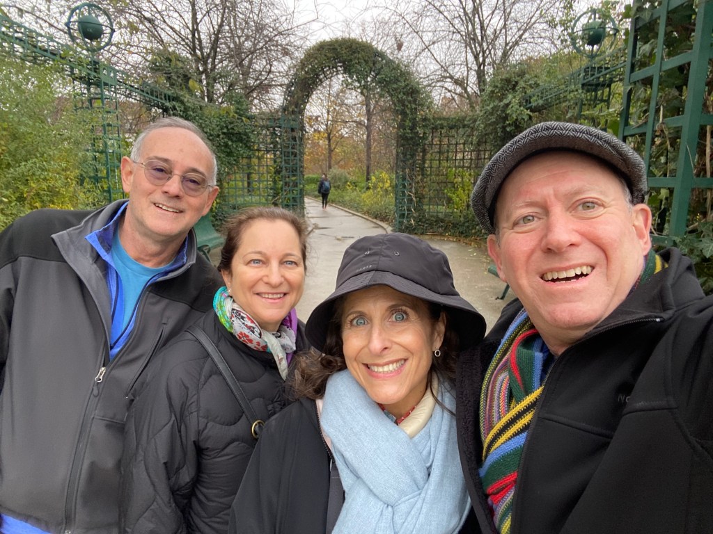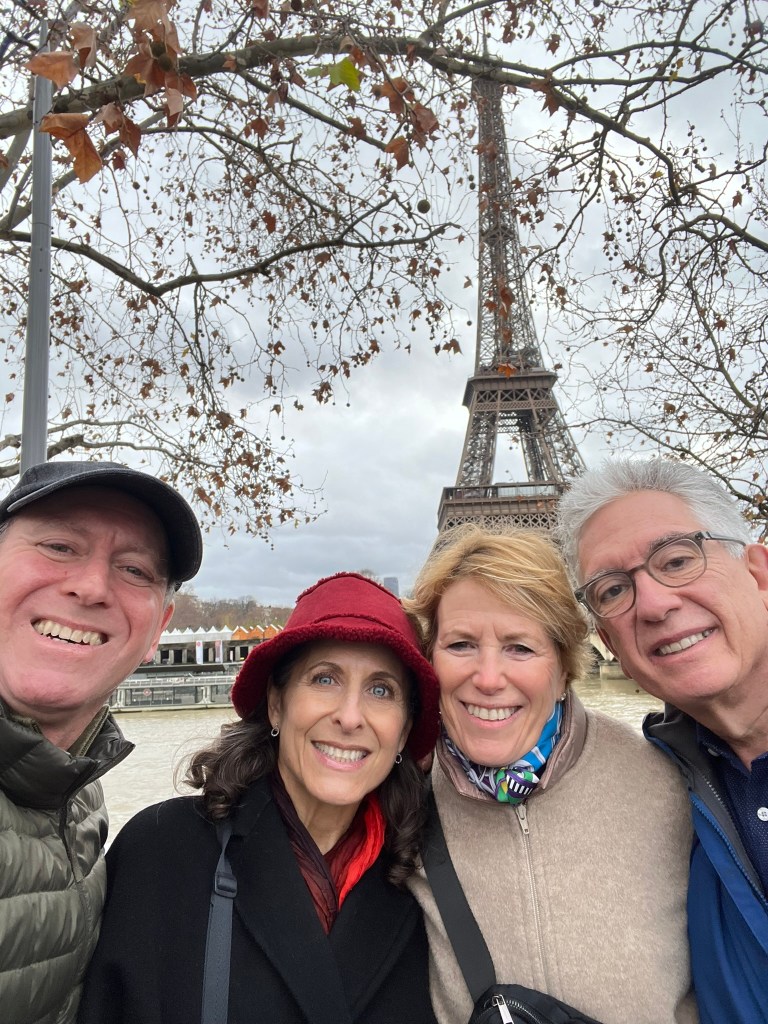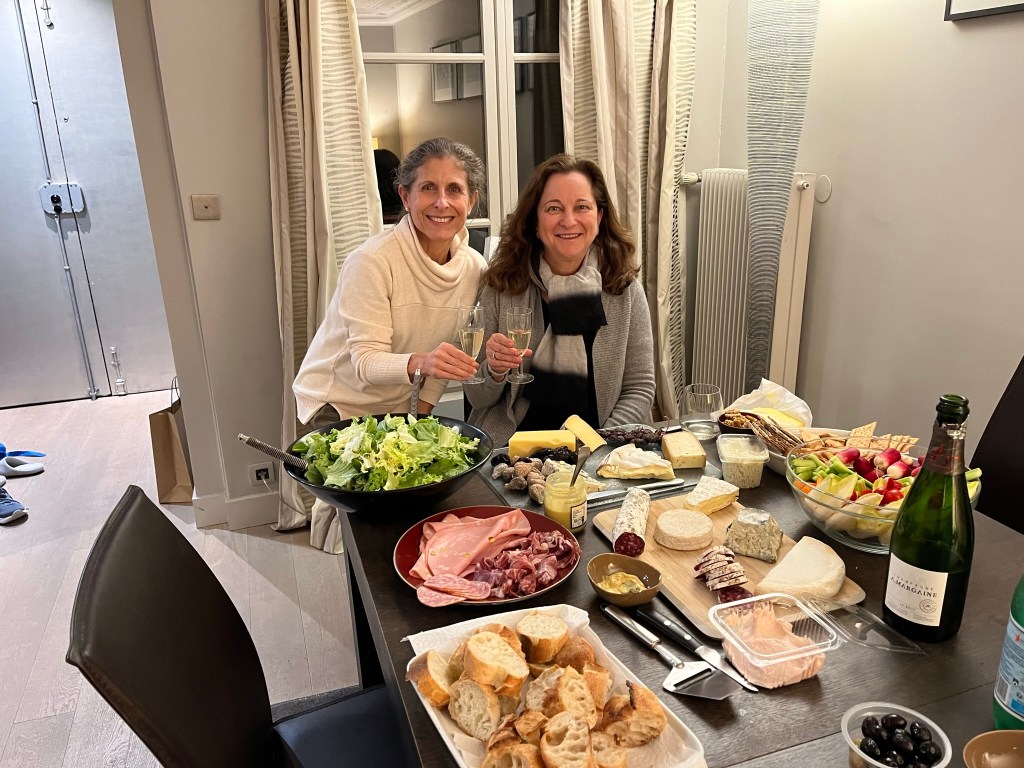 Some highlights of our time together with Lisa and William included their vast knowledge of French food. We dined together at a classic Montmartre restaurant (Le Bon, la Butte), a classic brasserie with a plateau de fruits de mer, and a classic restaurant for cassoulet (L’Assiette). But the BEST meal was our in-house market meal, of wines, baguettes (traditional, bien sûr), cheeses, charcuterie, crudités, walnuts, rotisserie chicken with roasted potatoes, radishes with salted butter and salad (a concession to me). Did I mention butter? There is nothing like any of the aforementioned items anywhere in the world and that goes for the butter (many of our visitors have stashed French salted butter in their checked luggage as souvenirs). Arlene and David joined us for this special meal — I really don’t think the fit Parisian folks can possibly eat this way but we sure can!