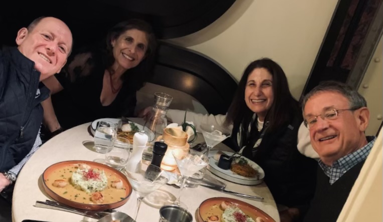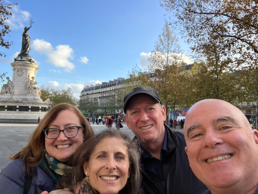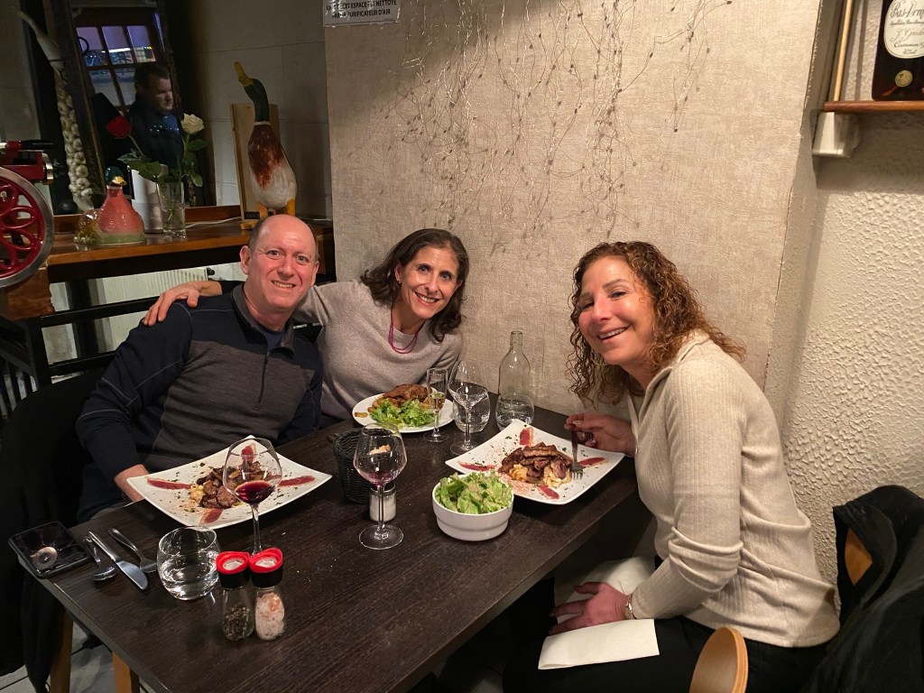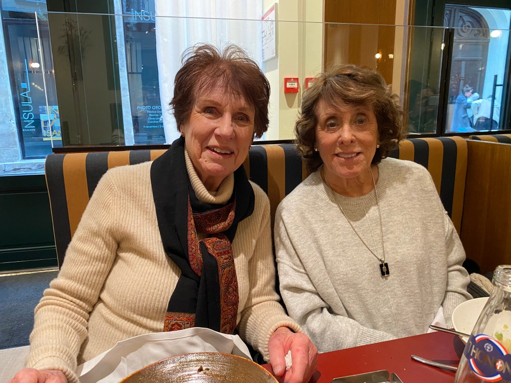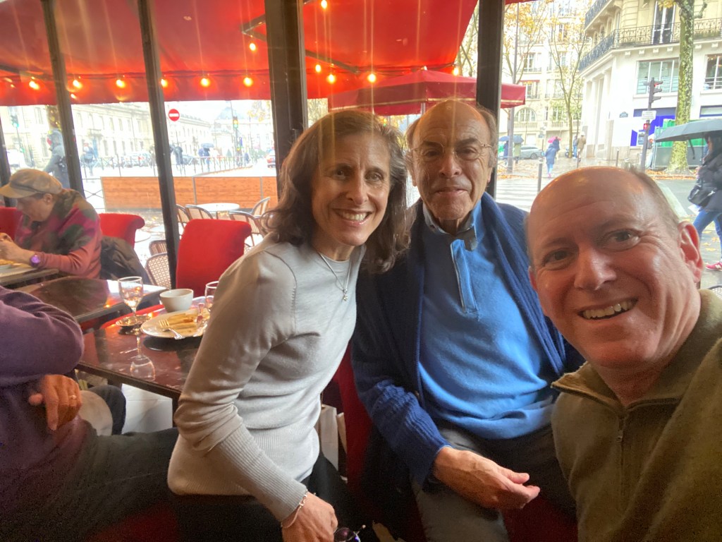 Some highlights of our time together with Lisa and William included their vast knowledge of French food. We dined together at a classic Montmartre restaurant (Le Bon, la Butte), a classic brasserie with a plateau de fruits de mer, and a classic restaurant for cassoulet (L’Assiette). But the BEST meal was our in-house market meal, of wines, baguettes (traditional, bien sûr), cheeses, charcuterie, crudités, walnuts, rotisserie chicken with roasted potatoes, radishes with salted butter and salad (a concession to me). Did I mention butter? There is nothing like any of the aforementioned items anywhere in the world and that goes for the butter (many of our visitors have stashed French salted butter in their checked luggage as souvenirs). Arlene and David joined us for this special meal — I really don’t think the fit Parisian folks can possibly eat this way but we sure can!