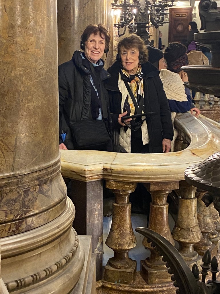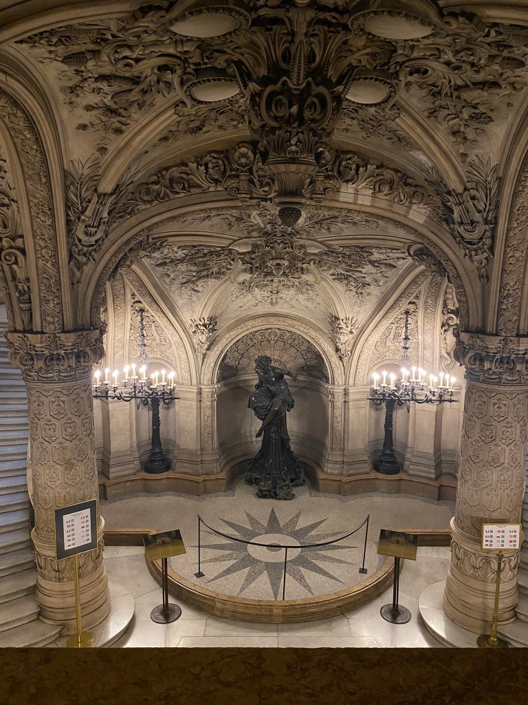 Rena, Sally and I took a self-guided audio tour through the Palais Garnier, the Paris Opera House, home to the ballet. This magnificent theater took 14 years to build by architect Charles Garnier. It opened in 1875 but had been commissioned by Napoleon III (who also commissioned Haussmann to rebuild and reroute Paris). And BTW, Napoleon was deposed in 1870 and died in 1873 so he did not get to enjoy this commission.