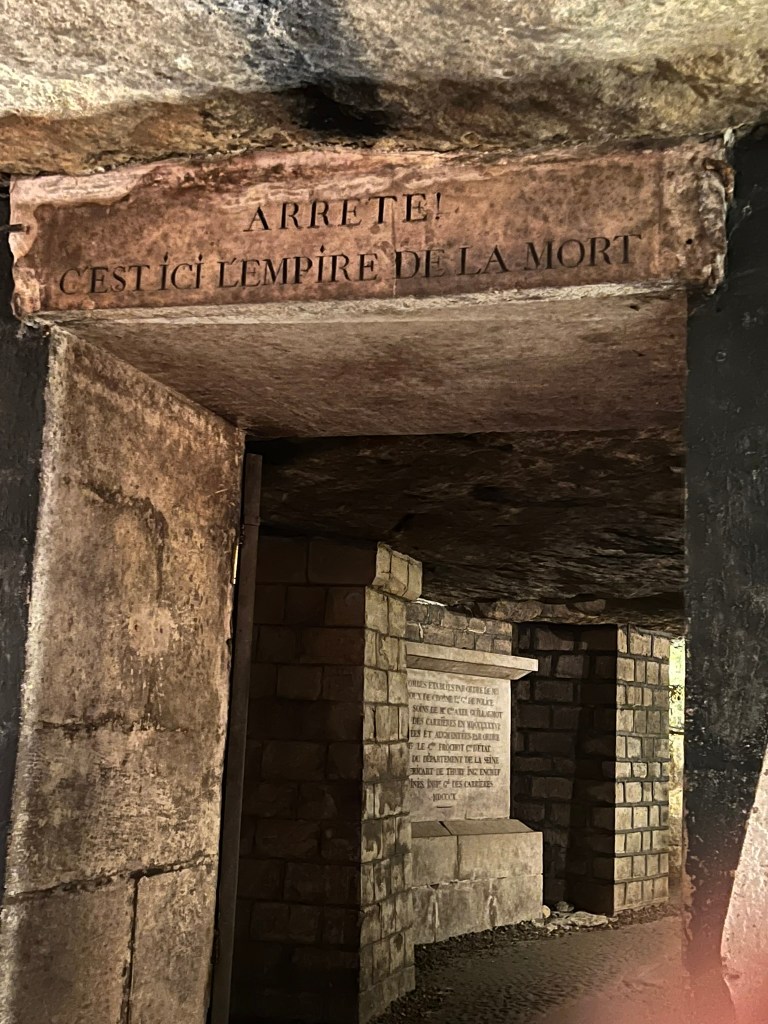 CATACOMBS: let’s be thankful we don’t have them at home. Everything about this place was a complete surprise to me and while I think the pictures say it all, I will add my take. Unlike the Catacombs of Rome, which preceded the ones in Paris by centuries and have connections to religious institutions, the Paris catacombs came about in the late 17th century, out of necessity and do not have the same sacred significance. The French, capitalizing on the popularity of the catacombs in Rome, found a solution to two problems: the problem of collapsing buildings where miles of underground mines had existed and the problem of overcrowding cemeteries. It is estimated that there are six million dead bodies throughout the tunnels. The church relinquished its role in burial practice and the government took charge. The tunnels are filled with layers of remains and the cemetery of their origin and year is marked in each section. There are even some boldface names whose remains are there including Robespierre, Colbert, Rabelais and Lavoisier.
