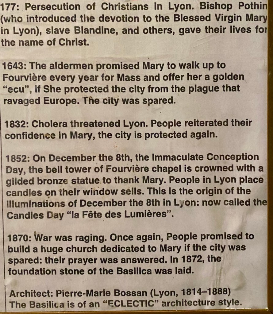 The name Lyon comes from Roman times when the area was named Lugdnunum. It was referred to as the second Rome and was the capital of Gaul complete with theaters built during Hadrian’s rule, for crowds of 10,000. Still in use, this hillside Roman theater holds outdoor concerts for 3,000 people. Fouvière Hill, la colline qui prie, is named “the hill that prays” for a good reason. Throughout Lyon’s history the Virgin Mary has saved the Lyonnais from plague, doom and war. Because of this, a “Minor Basilica,” honoring “the Virgin” was vowed to be built when Mary came to the rescue in 1870, again protecting the people of Lyon. The result is the stunning Notre-Dame de Fourvière (1897), built by the people to honor the Virgin Mary.