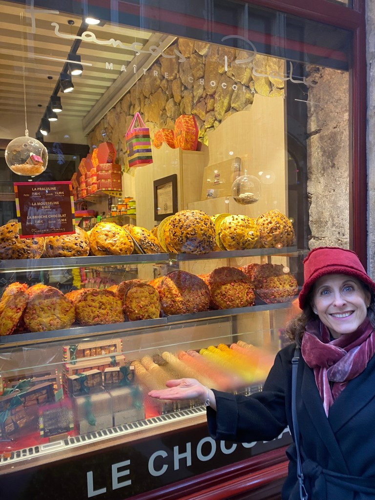 We tasted some of Lyon’s specialties en route, including charcuterie and cheeses as well as the most delicious pink Praluline brioche, a specialty of Patisserie Pralus (also located in Paris 😋). Then we had a traditional Bouchon lunch at Chez M’man. Most of our tour was in Vieux Lyon where we explored the traboules, covered passageways between the cobblestone streets that have been maintained for centuries and are open to the public during the day. Legend has it that as Lyon’s population grew, they were created to add space above and between buildings. The traboules were also helpful hiding places for Resistance fighters during World War II. Lyon’s Gestapo chief, Klaus Barbie, the “Butcher of Lyon,” was tried and convicted in here. Unfortunately for us the Resistance and Deportation History Center was closed during our visit.