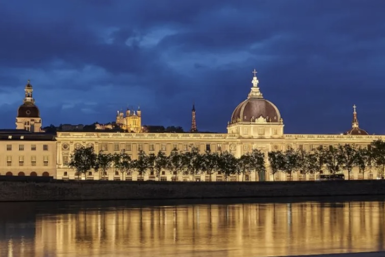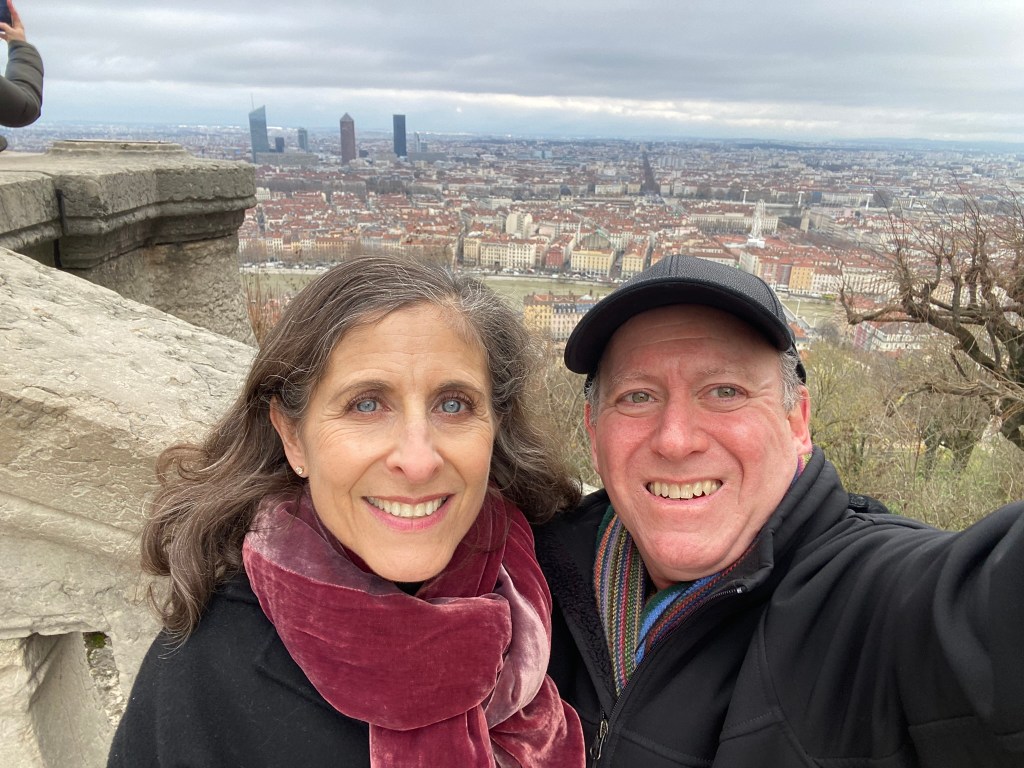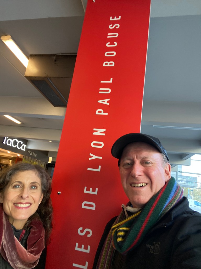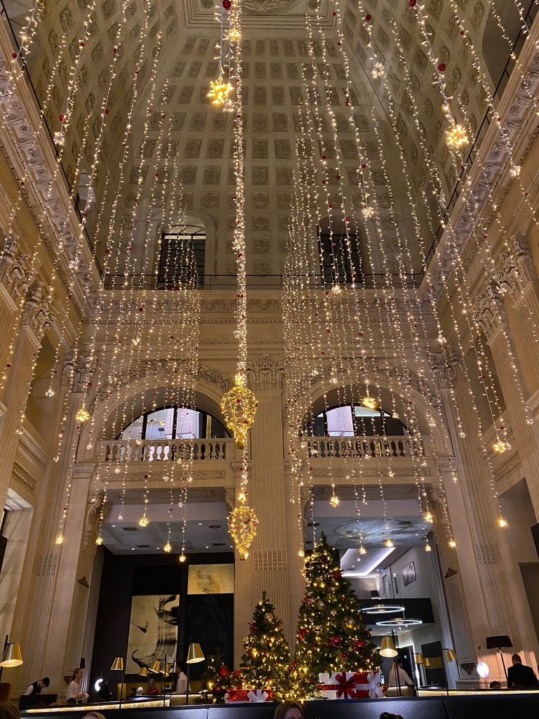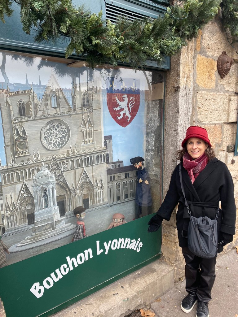 But first, our hotel, the “new,” since 2019, InterContinental Lyon – Hotel-Dieu, on the Presqu’île. As a UNESCO Heritage Site, its renovation was highly regulated but its beauty and history remain. From 1741 until 2010 this Hôtel Dieu was a public hospital run by the Catholic Church. It is said that today, one in three Lyonnaise was born in this complex. The many patrons who funded the Hotel-Dieu, dating from 1482 (the original hospital) through the 20th century, are honored on the cloisters’ walls, their names and contributions engraved. The layout was designed so air would circulate, improving patients’ health. The landmark Soufflot Dome, named for its architect, held a chapel and was situated in a way for patients to “attend” church from their hospital bed. That dome is now a gorgeous and award-winning cocktail bar, Le Dome — no way we were going to miss that! The Hotel-Dieu also includes shops, restaurants, bars, cafes, experiences and at this moment, a Christmas market. Our room was beautiful with silk curtains, honoring Lyon’s silk manufacturing which boomed from the 15th until the 18th century, a view of the Rhône River and a shower with a real shower door!