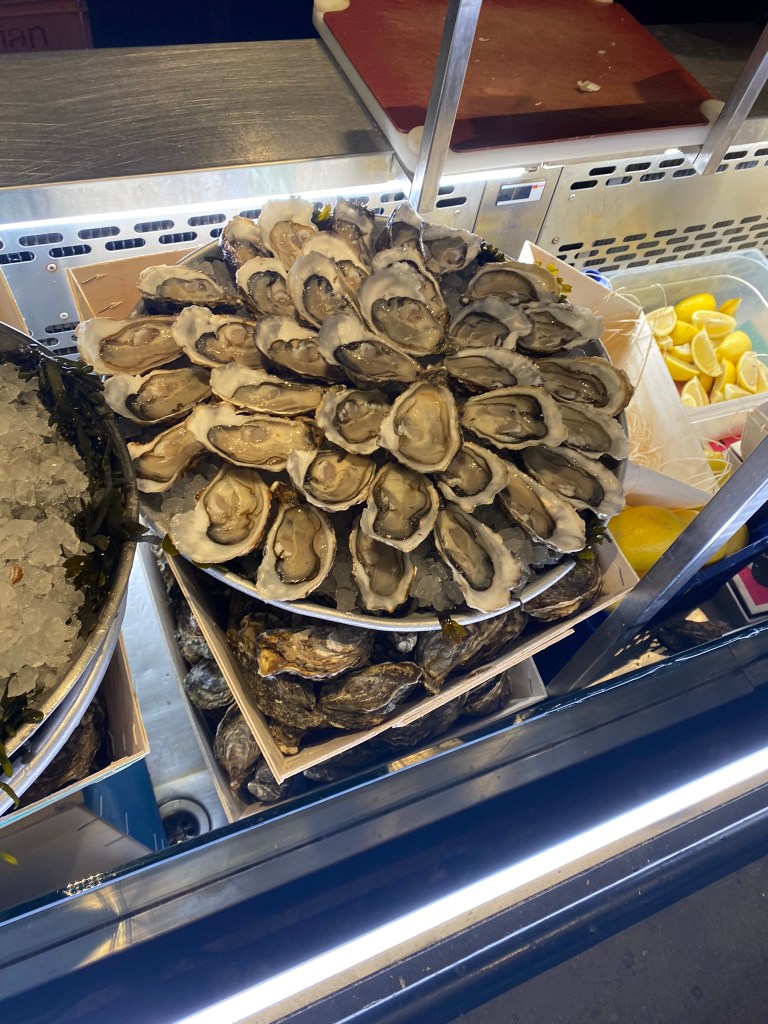 Our Sunday morning started with gym time, much-needed after the aforementioned meals and beverages. Our next culinary adventure took us to the east bank of the Rhône to Les Halles de Lyon Paul Bocuse. We had a nice quiet walk to this market, named for the father of nouveau cuisine. Once we arrived within the halls, we realized where all the people were: it was mobbed! This giant food court had a bit of Eataly and a bit of Reading Terminal Market in its DNA. There were many food stands with meats, cheeses, fish, oysters, produce and pastries. To quote Andy, “If our friend Jordan was here, we’d be tasting everything.” Unlike back home, France’s markets do not provide tables for enjoying market purchases, but there were all kinds of restaurants. We had no idea that reservations were needed at most restaurants and all that food was making us quite famished. Fortunately we were able to get a table and enjoyed a seafood lunch. It was quite a scene and some great people-watching.