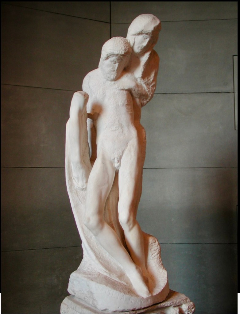 From Santa Maria delle Grazie, we walked to the gigantic Castello Sforzesco, a 14th century fortification complete with moat and drawbridge. It now houses nine museums and other cultural institutes. Lucky for us, the first Sunday of the month is free and open to the public; we arrived before the crowds. We visited the Pietà Rondanini by Michelangelo (1475-1564), an unfinished sculpture that the artist worked on during his final years. It is an emotional depiction of mother and dying son. Jesus’s body is emaciated and both he and Mary are elongated with a manneristic look. Interestingly, there is an arm that the artist seems to have been eliminating from the work at the time of his death; it does not “fit” the weakened physique of Jesus. But it was so interesting to see how this work in progress, with its different styles, is still there for us to see.
