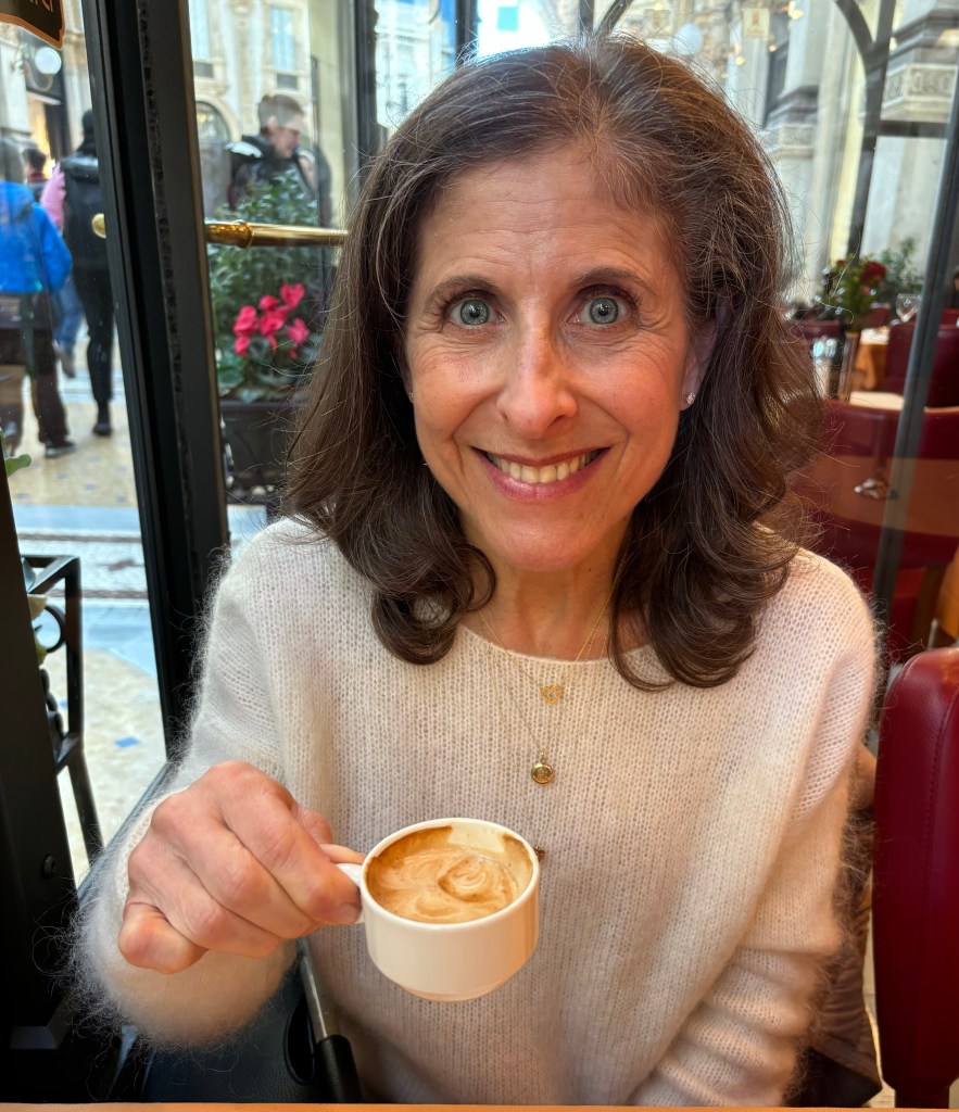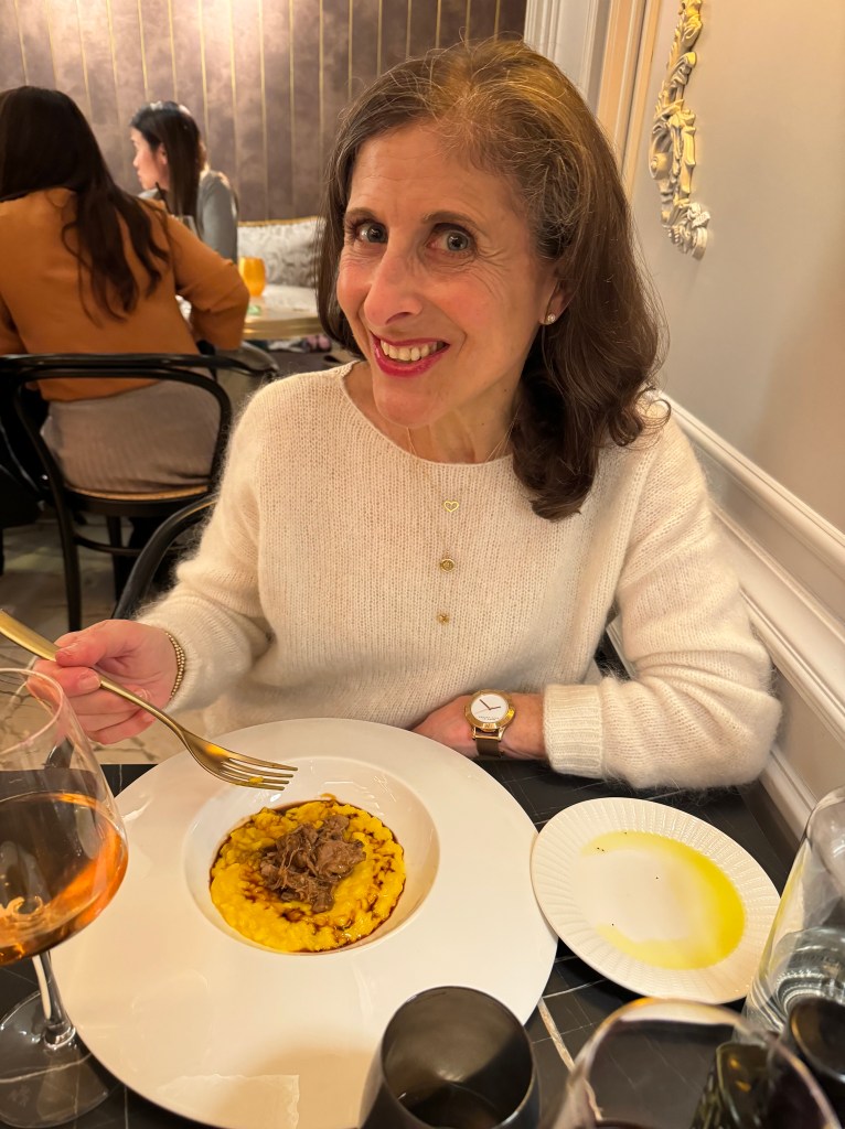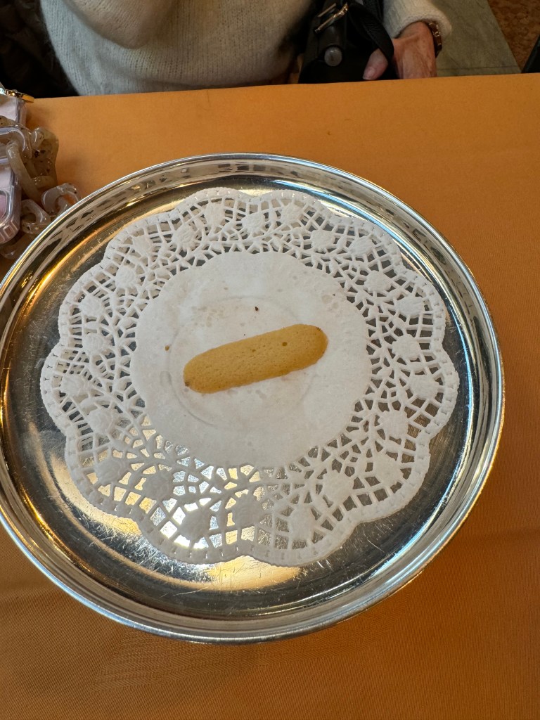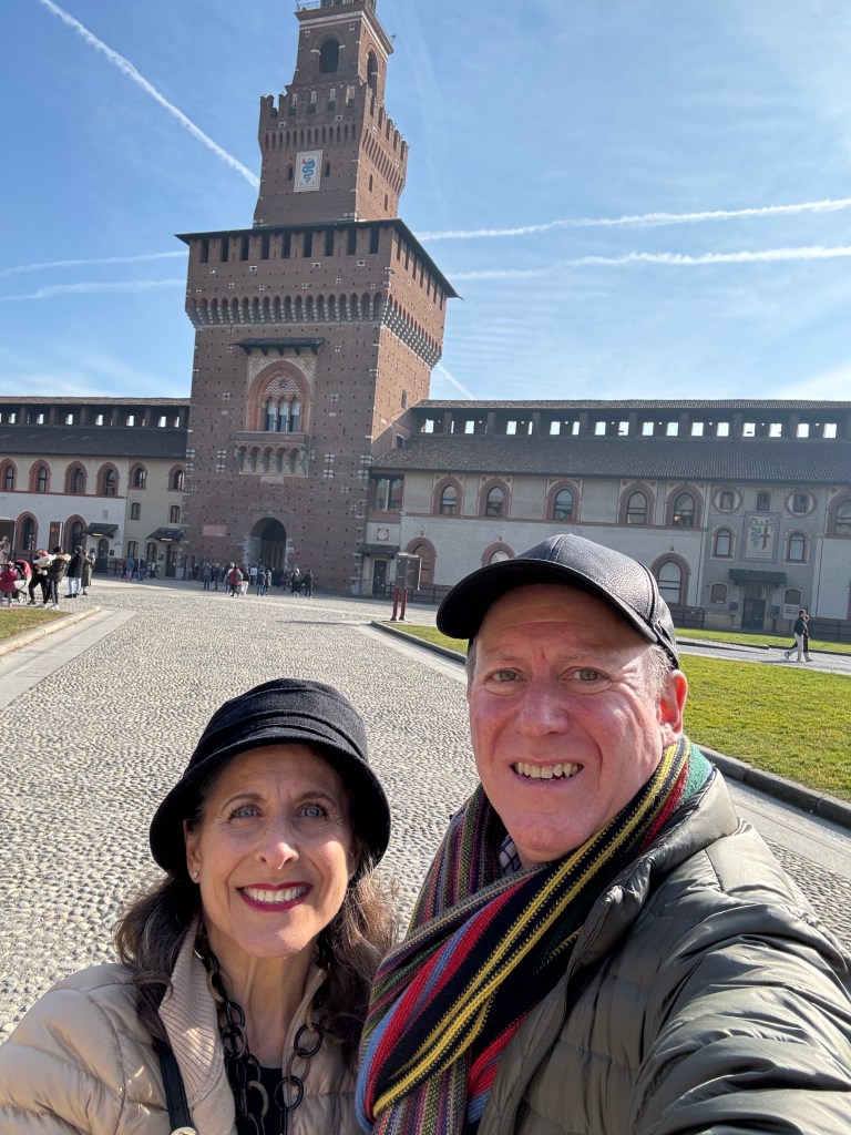 Since we were in the Lombardy region of Italy, we opted for a Northern Italian dinner at Ristorante Nabucco, so named because Giuseppe Verdi frequented the restaurant’s neighborhood. It was the perfect place for us to dine and recall Verdi’s 1841 opera with its beautiful Chorus of the Hebrew Slaves, one of my favorites. The waiters were very nice (the host gave me a tour of the historical rooms in the restaurant) but they had no idea what I was talking about when I mentioned Nabucco’s beautiful chorus 🎶🎵🎶. We dined on risotto, a thick veal chop Milanese (Andy) and a delicious fillet of sea bass (for me). We fell in love with dessert, semi freddo al cioccolato gianduia crumble al caffè, caramello salato 😋 (gianduia chocolate semifreddo, coffee crumble, salted caramel) and, as often in Italy, we received limoncello, a marvelous digestivo, to finish our meal. We strolled back to the hotel along the large cobblestone streets, passing restaurants that were still filled with people, just delightful.