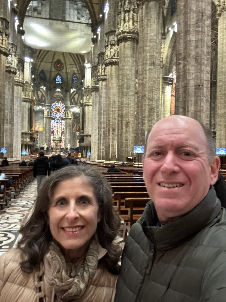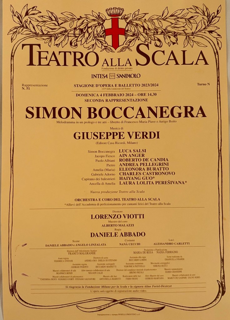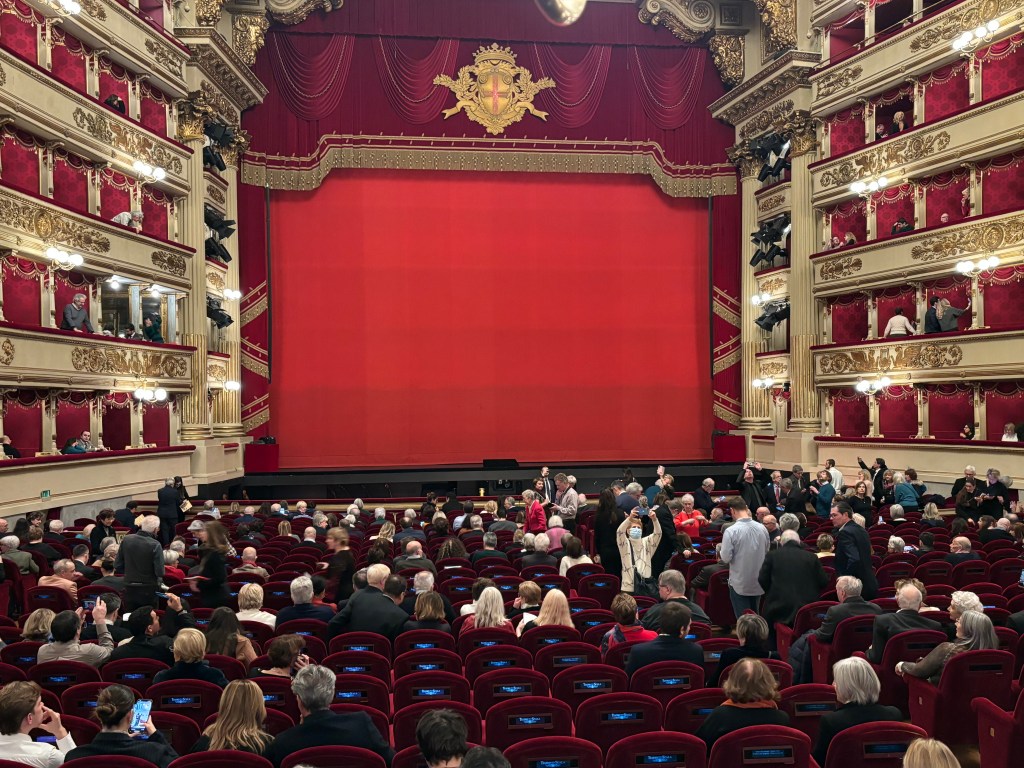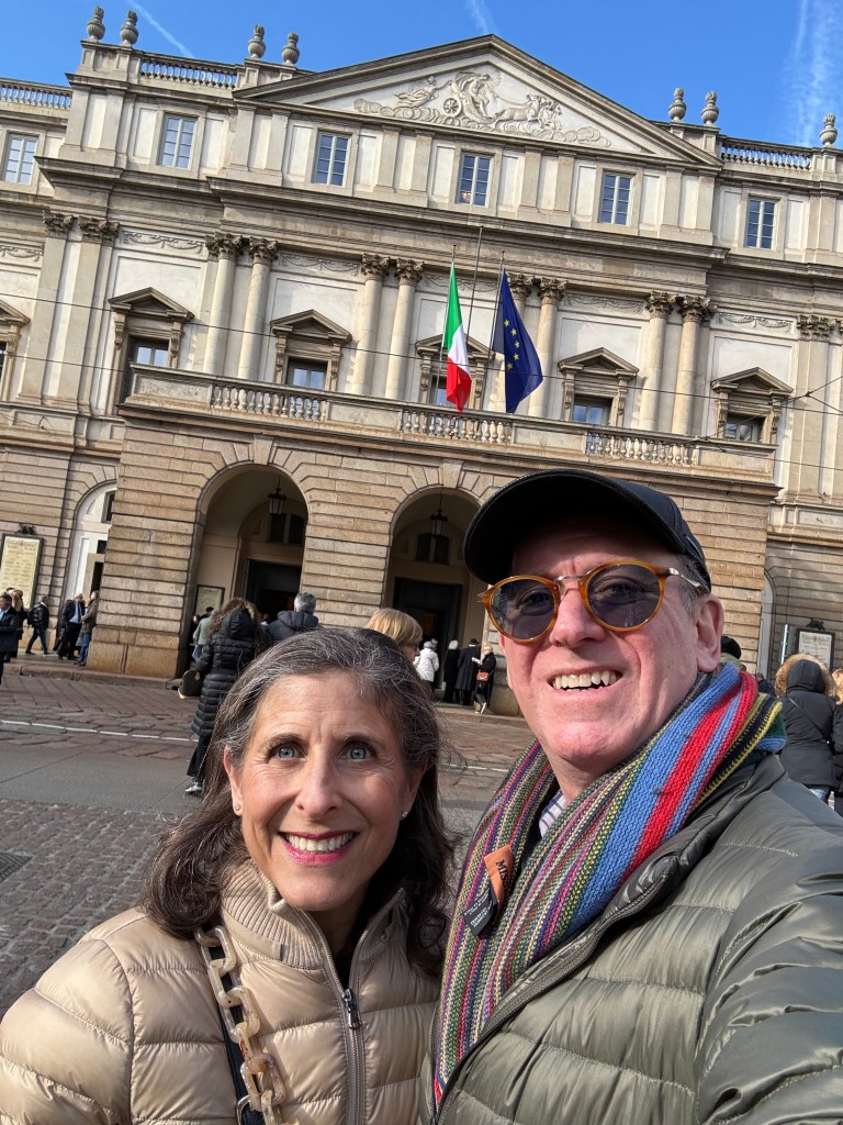 Our afternoon activity was another Milan highlight. We went to Teatro alla Scala to see Verdi’s opera Simon Boccanegra. We had never seen this opera and interestingly, it got a lot of press, even in New York, before opening. If you are interested, see The NY Times article of January 20, “A New Production of a Verdi Opera Tightens Family Ties.” True confession, I had to read the synopsis three times to get what was going on. In fact, Verdi found it necessary to rewrite the opera after the original got panned for being too complicated and confusing. There were mistaken identities, forbidden love, kidnapped illegitimate daughters unknowingly ending up in the care of a grandfather. There were reunions of father and daughter. There were wars among the people who did and did not support the Doge. There were poisonings and weddings and death (like all operas). the story of Simon Boccanegra is not unlike some of the more dramatic stories in the history of politics of the cities of Italy. These kinds of things really happened: #You can’t make this stuff up. It was a great production with huge operatic talent and we both loved it.