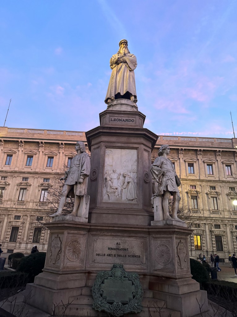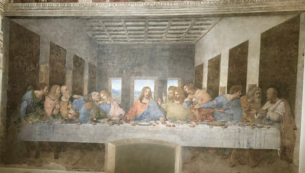 Sunday was another beautiful day in Milan. After breakfast we went to see Leonardo da Vinci’s Cenacolo (The Last Supper, 1494-98), a mural in the refectory of the Dominican convent of Santa Maria delle Grazie. A UNESCO World Heritage site since 1980, it is known for its beauty and its history. One of the most interesting things about coming to see this masterpiece is how secure the entrance to the museum is. At first I thought it had something to do with security (after all, on January 28, protestors hurled soup at Mona Lisa, fortunately, only splashing her bulletproof protective glass) but it’s actually about the preservation of the fresco. Leonardo created his frescos on drywall: fresco secco. Wet wall frescos withstand time better but Leonardo chose a method where he could more easily make changes when painting. In fact, the Last Supper began to deteriorate shortly after its completion and has been through many restorations. For visitors, one must wait between different enclosed doorways (reminded me of Get Smart) so that the air and humidity levels best preserve the fresco. Because of this, we were permitted fifteen minutes to view the two frescos in the refectory (which had been the cafeteria for the monks of the convent). This work of art portrays Jesus and his Apostles, each exhibiting different expressions, their vivid emotions recognizable and understandable. Leonardo also used linear perspective, with the vanishing point at Jesus’s right temple, the focal point of the painting. There is a lot of depth to this work, beyond the supper, out the window and to the mountains way in the background.