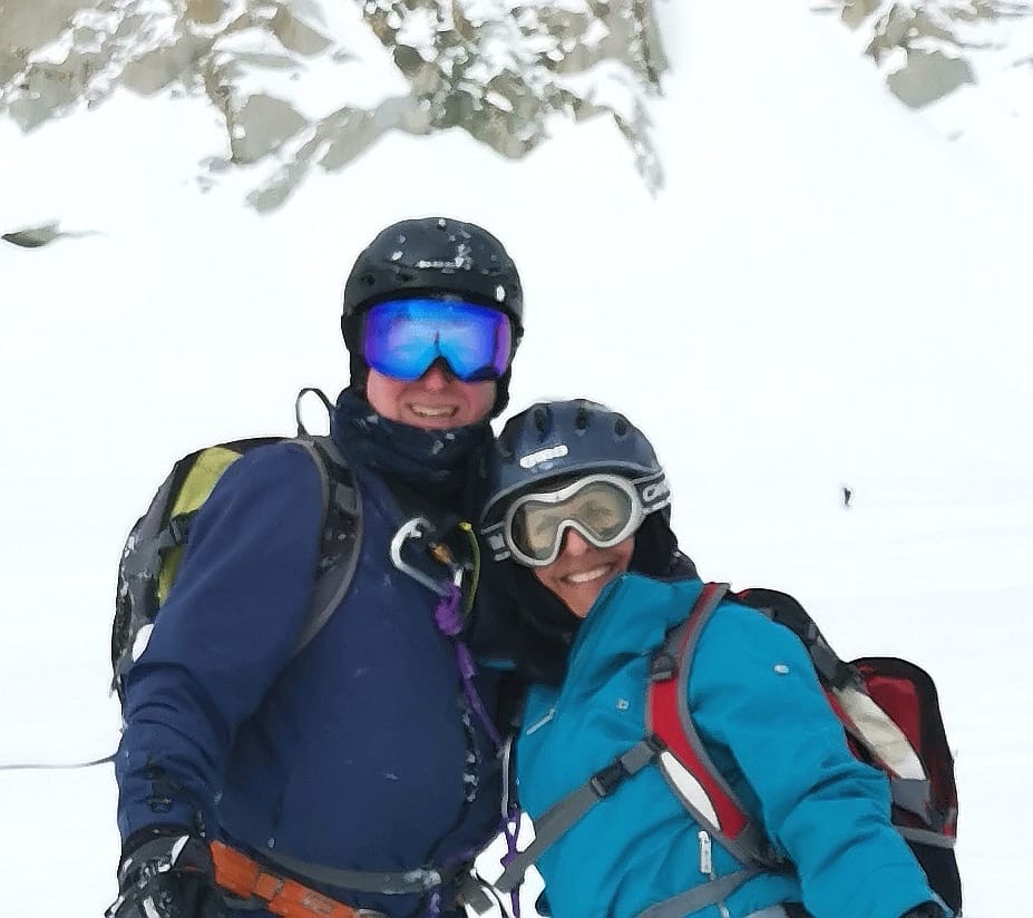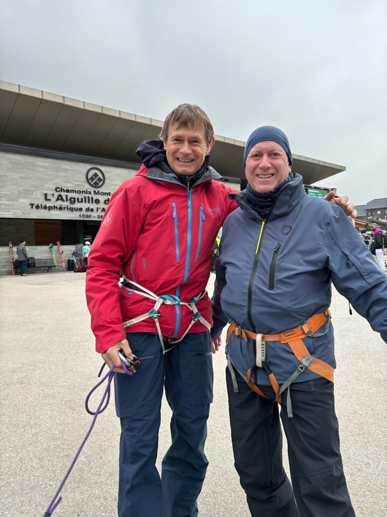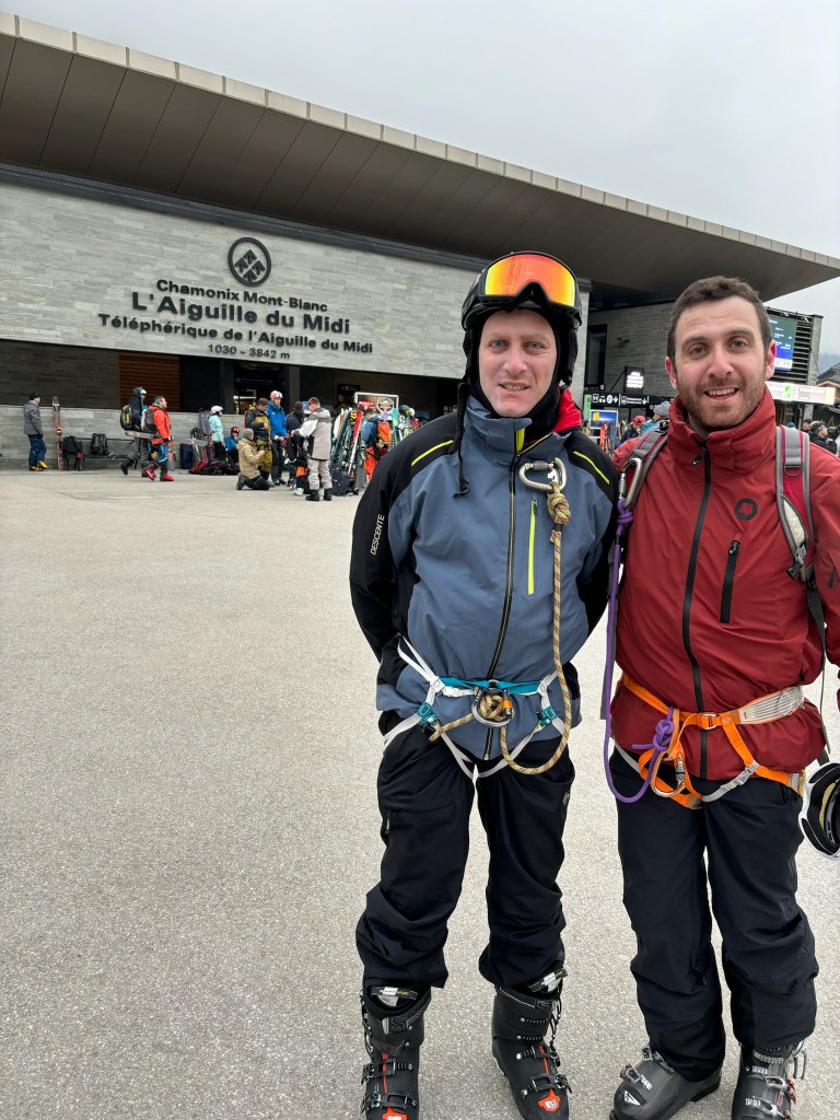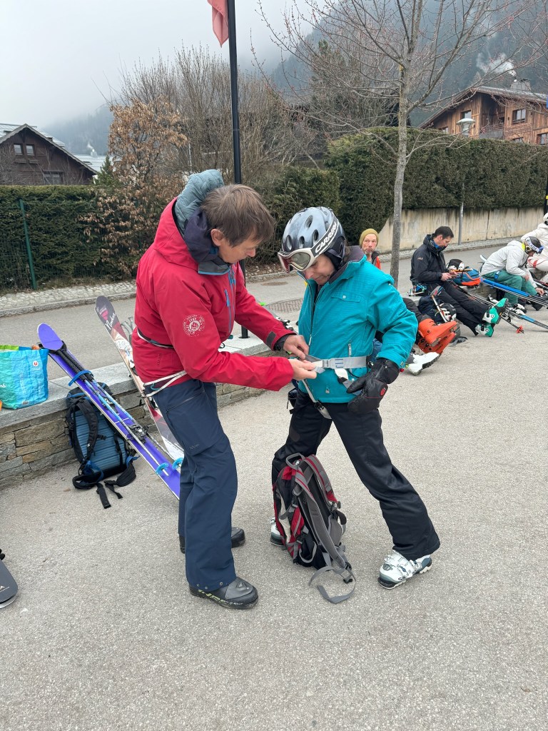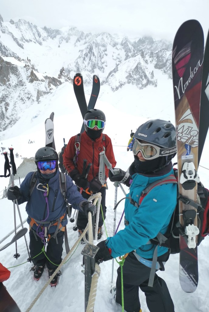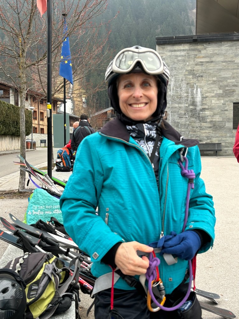 We engaged Yves, an experienced guide who was trained in rescue, to spend the day with us. We met Yves early Wednesday morning, on the plaza in front of the Aiguille du Midi cable car where he outfitted us with a harness, crampons, carabiners and avalanche equipment. And yes, this made me even more anxious. We ascended 3,812 meters, in two cable car rides to the Aiguille du Midi where we took in spectacular views and further prepared for our descent. I might add that the weather up there was cold, cloudy and windy so I was happy that we took our time (I was definitely procrastinating) with the hope that the weather would improve. This was one place where there was no line for the ladies room and a long line for the men. I was definitely in the minority, adding to my anxiety. What was a 60+ year old (under 5’) Jewish girl from Long Island doing up here? Skis affixed to our backpacks and crampons under our ski boots, we were ready to proceed through an ice tunnel to the ‘arête’. We were attached to each other by rope (which would save us should one of us fall) and we walked along a ridge with a 50-degree pitch to the left and the right. But worry-not, a safety rope on either side guided us while we marched down the snowy path as Yves instructed.
