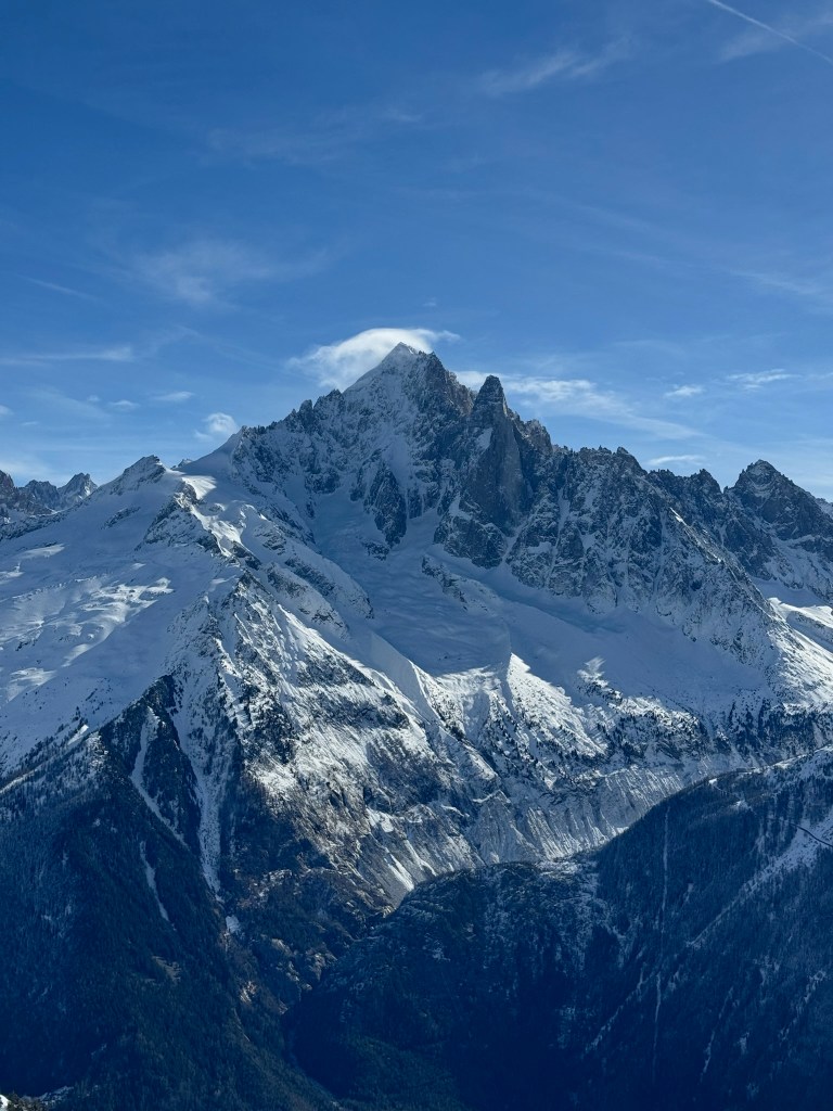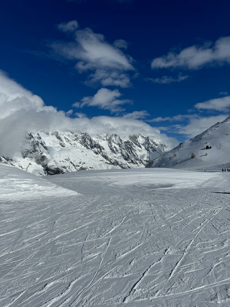 After lunch, the skiing was a bit easier. The Mer de Glace includes beautiful blue ice “waves” and we skied in an elevated valley between the peaks. One of the most interesting and surprising takeaways was the sound of rocks and pebbles descending the mountainsides. It was almost impossible to see what we were hearing but the sound was constant. Perhaps it was amplified by an echo.