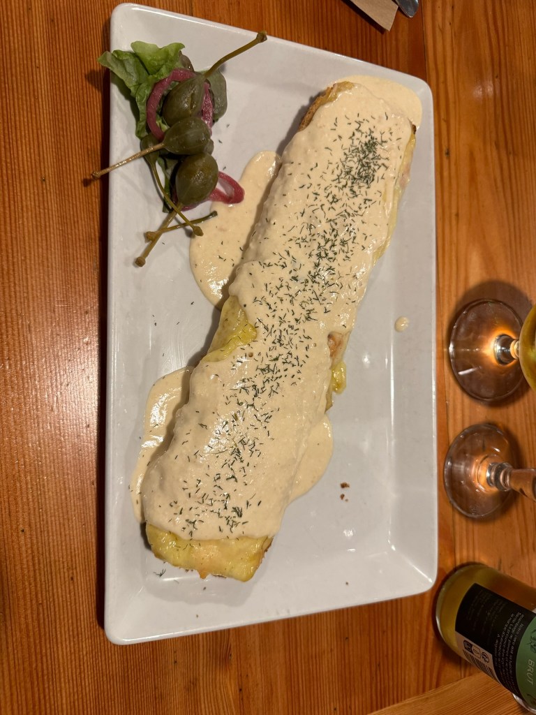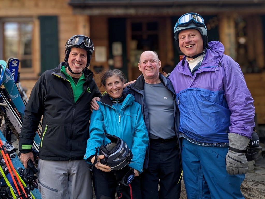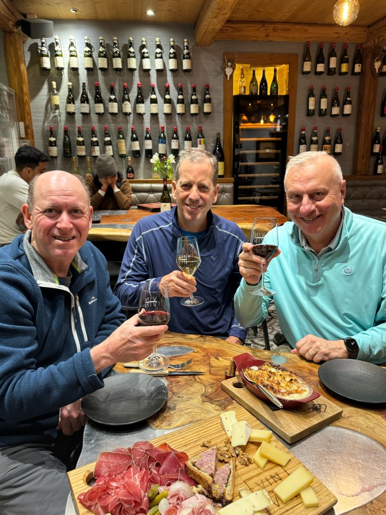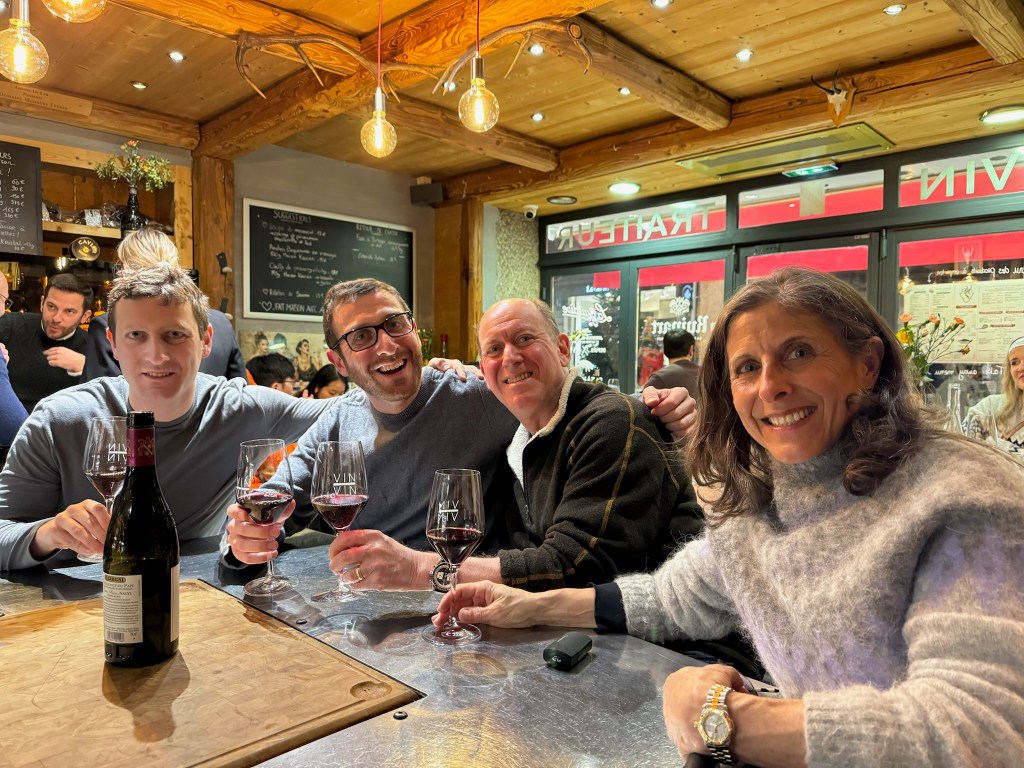 Our first visitors were Ron and Will, longtime friends of Andy from business school. The skiing was good and the company was entertaining. Highlights of our time together were some wonderful meals: dinner at Garde à Manger (translation: pantry) for a superb meal of charcuterie, croziflette, gravlax and wine; lunch just off the slopes of Grands Montets for the most authentic Savoyard cuisine at Crèmerie du Glacier (not so easy to ski after all that crème); dinner at Le Comptoir des Alpes for gourmet French cuisine; and a superb wine tasting at a local shop with lovely live music. I even baked and cooked a bit; one cannot go out for every meal (or at least I can’t)!