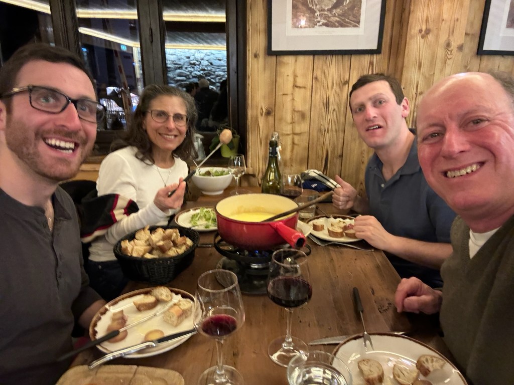 As we finished the skiing the Mer de Glace, we were able to use the new gondola to get up to the Montenvers Train Station. This gondola, thankfully, opened in early February and saved us from hiking up 550 steps in ski boots, carrying our skis. Stacy, this would have changed your entire experience! Thank you, New Vallée Blanche Exit Gondola! We took the charming retro-train back down to Chamonix Mont-Blanc and after returning to the apartment for showers, we rewarded ourselves with a fondue dinner. All in all, this was a day that none of us will ever forget!