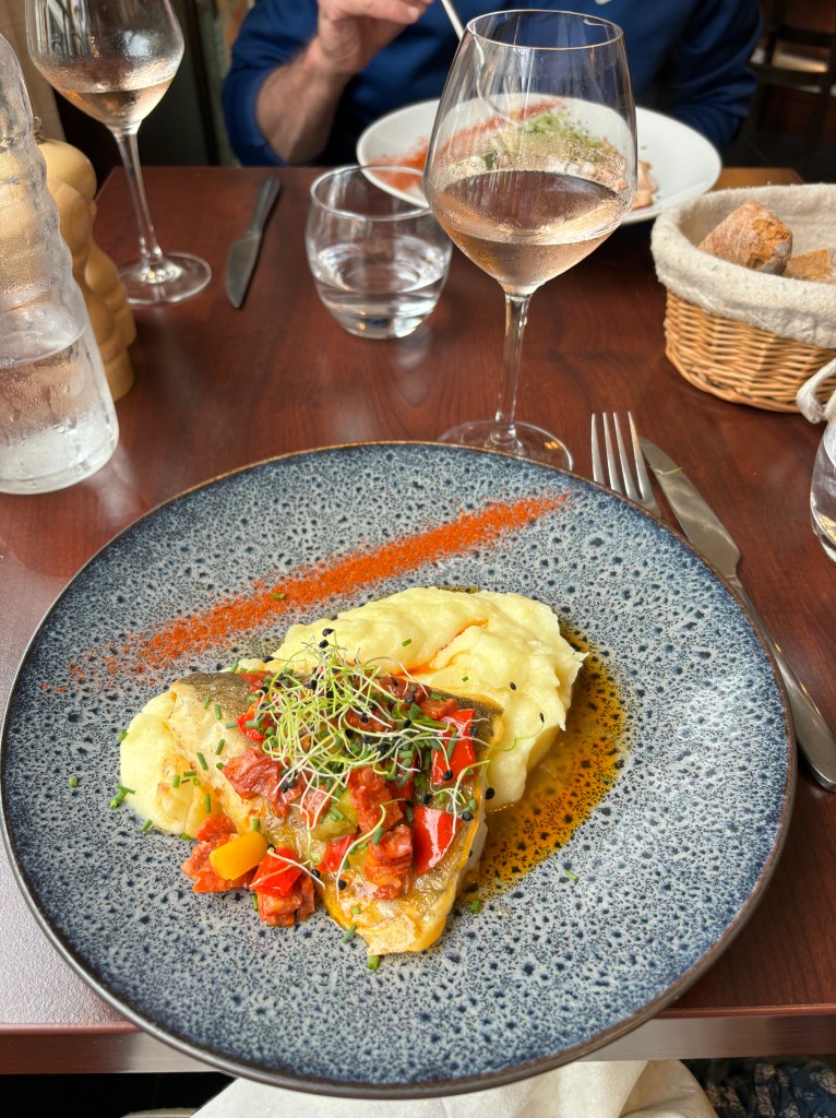 Most everyone who shared their restaurant list with us recommended Restaurant Elkano in Getaria (currently #28 on the worldβs Top 50 list) but we could only get on Elkanoβs waitlist. On our Balenciaga day, we noticed that we were right across the street from this must-dine spot so we popped in. They must have appreciated the extra effort, as they βfoundβ a table for us and our reservation became confirmed for our final evening in the San SebastiΓ‘n area. This was our best meal which included grilled whole turbot for two, Elkanoβs specialty. The fish is prepared on an outdoor grill and is accompanied by a simple sauce made with the fishβs natural gelatin, olive oil and finishing salt. Our server prepared our fish tableside and gave us βpermissionβ to pick up the fish bones to get all the juiciness off the bone. Dessert included cheesecake ice cream accented with a fruit sauce.