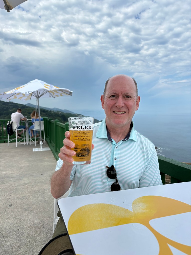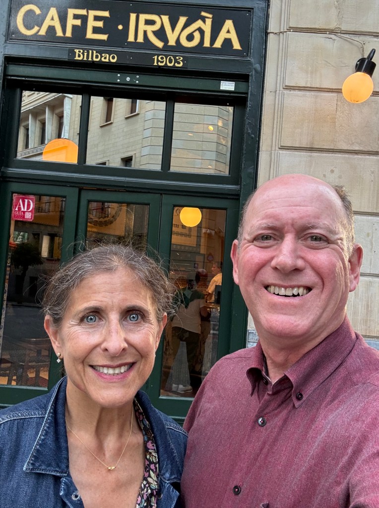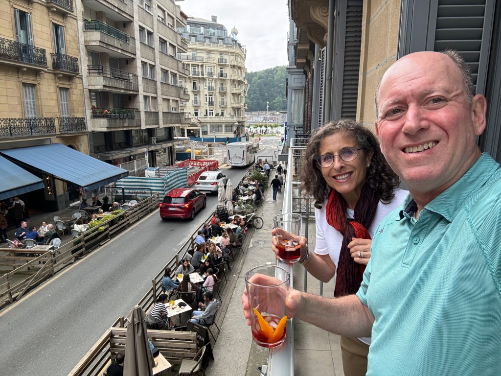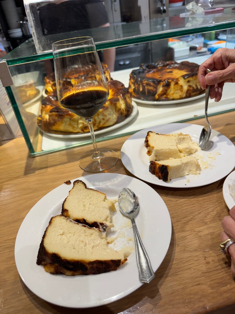 About Basque cuisine, I must share that if one skips the jamon and is careful about the pastries (we found that croissants in Spain are sweeter than those in France), the food of this region is about as healthy one can get. So much fresh fish, vegetables and βgoodβ fats like olive oil are on every menu. And most diners include a glass of Txakoli (a slightly sparkling, dry white wine), Sagardoa (the local apple cider) or Rioja. I tempered my alcoholic intake but enjoyed these local specialties. Whether we dined at a restaurant or enjoyed a pintxos-hopping experience, we took after-dinner strolls along the Bay of Biscay promenade with the perfect view of sunset. We enjoyed the regional cuisine at restaurants Narru and Portvetxe Erretegia Asador. And we really liked the cheesecake at La ViΓ±a.