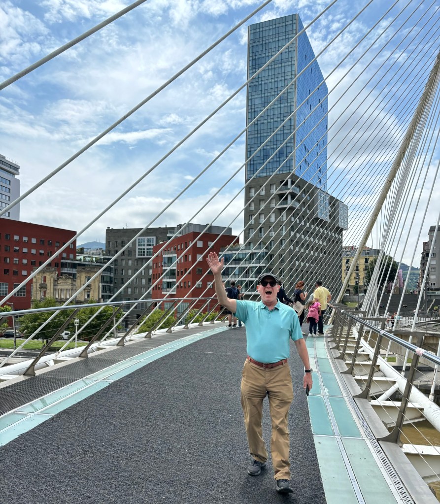 The best was yet to come. Andy and I had been to Frank Gehryβs Fondation Louis Vuitton in Paris and took an architectural tour there. Gehryβs Paris building was limited by the footprint of the bowling alley that had previously existed there. He did not have that issue in Bilbao. The building is enormous and constructed with titanium, glass and stone. It sits along the NerviΓ³n River and seamlessly connects to both the river and the Puente La Salve Bridge, balanced with Gehryβs addition of a 62 meter tower. Glass is an important element in the Guggenheimβs construction because it allows the museum to be open, taking one from the city to the river, Bilbaoβs main source of life from the days of industry and mining in the Basque region.
