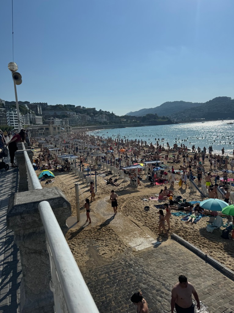 Between sightseeing and the day-to-day apartment upkeep (which included cooking a bit β one cannot go out for every meal), I kept busy while Andy did his bike rides and his work. That included writing and, if I have a good audiobook, there is nothing better than going for a run along the Bay of Biscay promenade. Even better for a runner is the fact that itβs so nice that upon completion of a run, there is no more beautiful a place to stretch than on said promenade. The views and people-watching are fabulous and quite entertaining. In spite of the often cooler weather (yes, folks were still wearing down jackets in June, but), if there was any sun at all, the beach was jammed with people of all ages and shapes, dressed in as little as possible (no matter their age). A typical scene is of a person, dressed in street clothing, arriving at the beach, draping a towel (or a friend helps) so a quick change can be made into a two-piece (although often it is one piece of a two-piece). Modesty? None whatsoever, which is why I cannot seem to figure out the towel for changing bit but that seems to be the custom. We enjoyed the beach after our morning exercise, entertainment and all β best people watching ever!