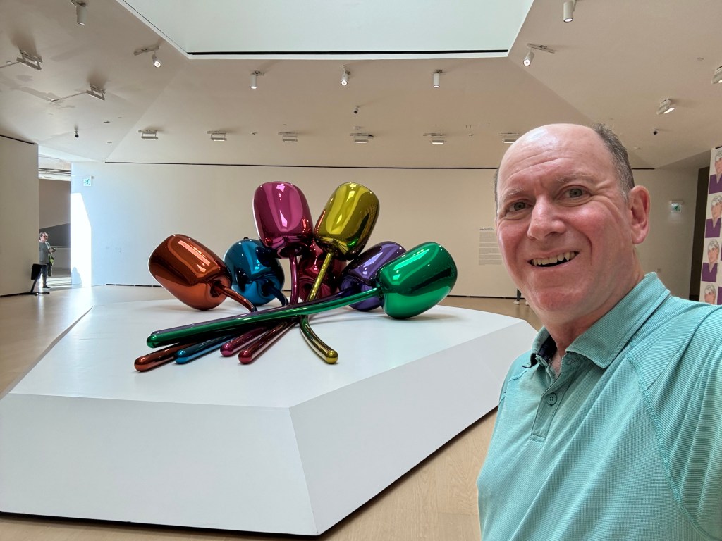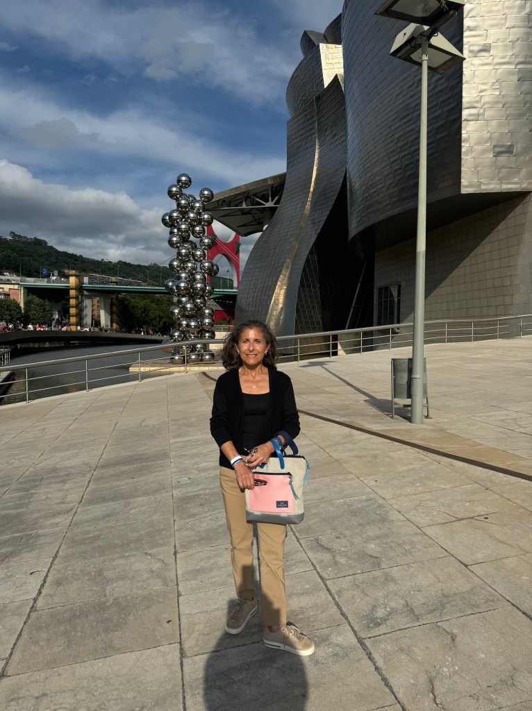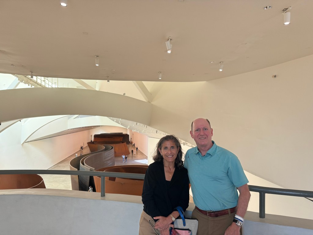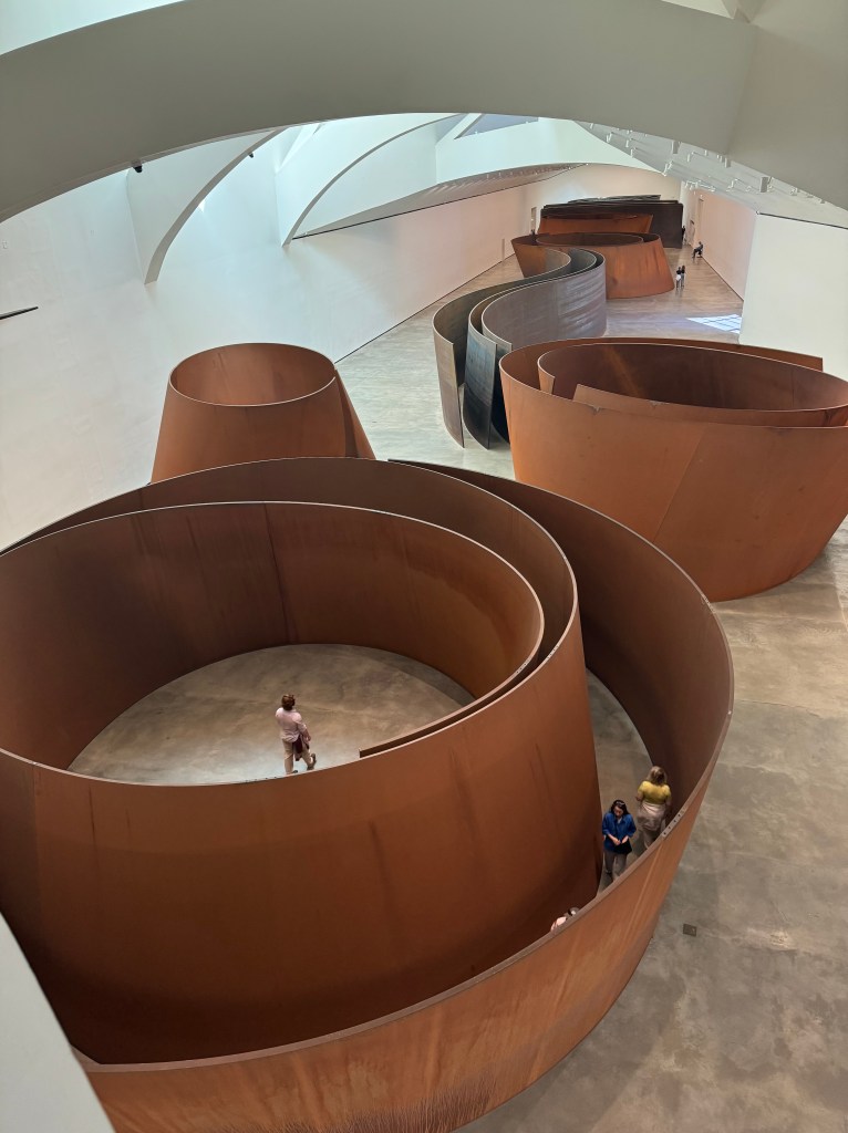 Inside the museum we enjoyed the huge installations of Richard Serra (1938-2024) Snake and The Matter of Time. Eight monumental works of art were created between 1994 and 2005 and we were able to navigate them while listening to Serraβs comments about their construction and interpretation. The compositions give the viewer perspectives from every vantage point, inside, outside and below, making the viewer an integral part of the experience.