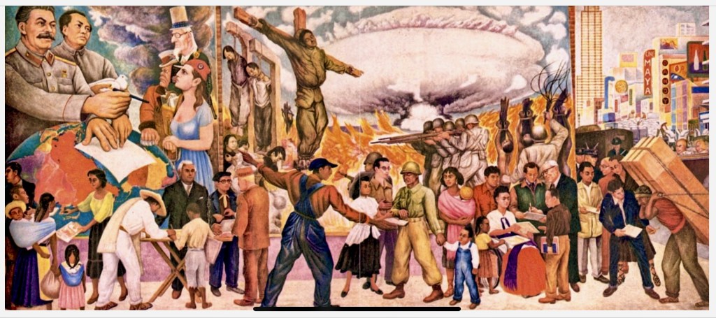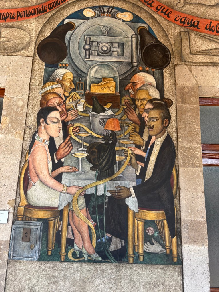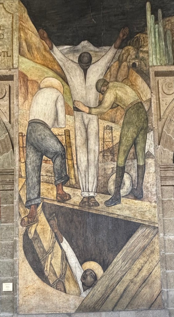 The artistic movement known as muralism developed in Mexico in the early Twentieth Century. From what I have seen and read, muralism was a social movement, even leading to today’s contemporary street art (see my post about Amsterdam and the Straat Museum from November 2023). Muralism’s most famous artist was Diego Rivera (1886-1957). In September, the Museo Vivo del Muralismo (Living Museum of Muralism) was inaugurated after a few years of fresco restoration. It is housed in the Secretariat of Public Education (SEP) and is a showcase of murals painted between 1922 and 2010. When the SEP originally opened in 1922, its secretary commissioned Diego Rivera to create frescos throughout the building and did he ever; there are more than two hundred panels. Since the building housed the offices of education, these murals were quite educational, especially if you were a Communist (the party in which Rivera belonged). His murals addressed themes about social justice, political activism, indigenous heritage and working class struggles. Rivera’s frescos depict Mexican history, agriculture and ancient symbols of the Mesoamerican period (pre-Spanish). They promote communism, discredit religion and depict greedy capitalists and crooked politicians. These murals have been labeled propaganda art and include many symbolic hammer and sickles as well as red stars.
